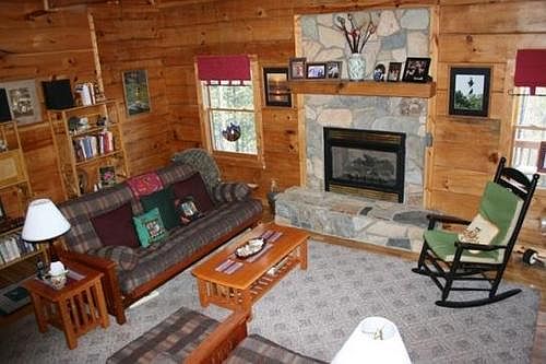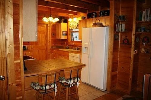 Idyllic log home with year-round panoramic views! Meticulously maintained home features an all wood interior with exposed beams. Raised ceilings in the master and second bedroom and cathedral ceilings in the living area. Stone-faced gas fireplace adds to that cozy mountain charm. Hardwood and tile throughout the home, along with all tile counters. Master features a walk in closet, double vanity, tub shower, and private access to the screened in porch. Third bedroom is located in the loft with exposed beams and a huge closet. Second bedroom also has access directly to the back porch.