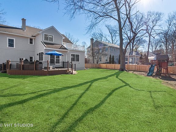 Spring Fever? This totally transformed, super sunny, East Glenview, (Romona-Wilmette and New Trier School district) move-in home is sure to please! Curb Appeal galore and huge fenced yard(11,920 sq ft) boasts new Trex deck with room for your grill(s), raised bed planters, deluxe swing set and storage shed will get you living large outdoors! Indoors is even a bigger treat. Inviting Living Room with delightful big bay window and handsome built-ins are open to an equally bright Dining Room with plenty of room for a serving buffet. The big bang--a lovely white/stainless updated kitchen with peninsula is open to a very large family room with ample room for casual dining as well. Fabulous sight lines and circular flow throughout this house-- from the kitchen to the family room, through lovely french doors to the deck, and back yard. Upstairs is a sizable, serene primary suite and large white primary bath with separate shower and large corner tub. Three additional generously-sized bedrooms--one with access to great walk up attic storage, and another is large enough to be used as a home office and guest bedroom combination. The lower level offers more "play" space for young/old alike. Throw in a load of laundry in the utility room, and let the "youngers" enjoy the the sunny rec room, while you try to squeeze in some time in the adjacent workout room, or alternate private home office. There is a former finished darkroom which is currently not in working order. (But perhaps could be?) There is direct access inside the house from the extra deep one car HEATED attached garage with lots of storage in front. There is plenty of room in the driveway to park additional cars on the wide side driveway. Great in-ground basketball hoop/backboard for driveway pickup games. All of this situated 2/3rds of the way down a quiet cul-de-sac. Walk to Cunliff Park, or quick ride to Wilmette schools, NT Northfield Campus, Loyola Academy and both Villages--Glenview and Wilmette with the benefit of Glenview taxes. GREAT HOUSE to cure your spring fever!