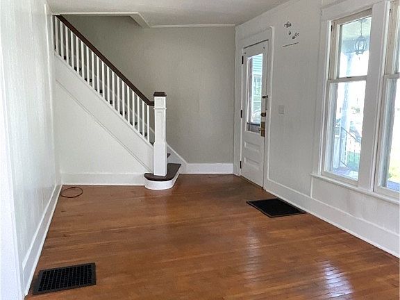 Nicely sized two bedroom and 1 bathroom apartment which is an upstairs/ downstairs apartment in a duplex. There is an additional room upstairs that could be used as a 3rd bedroom or office. The driveway and garage are shared with the other side of the duplex but there is 1 garage bay available for parking. Nice open porch that is not shared and this sits on a corner lot. NO SMOKING INSIDE, No Pets, and Security Deposit is due at Lease Signing.
