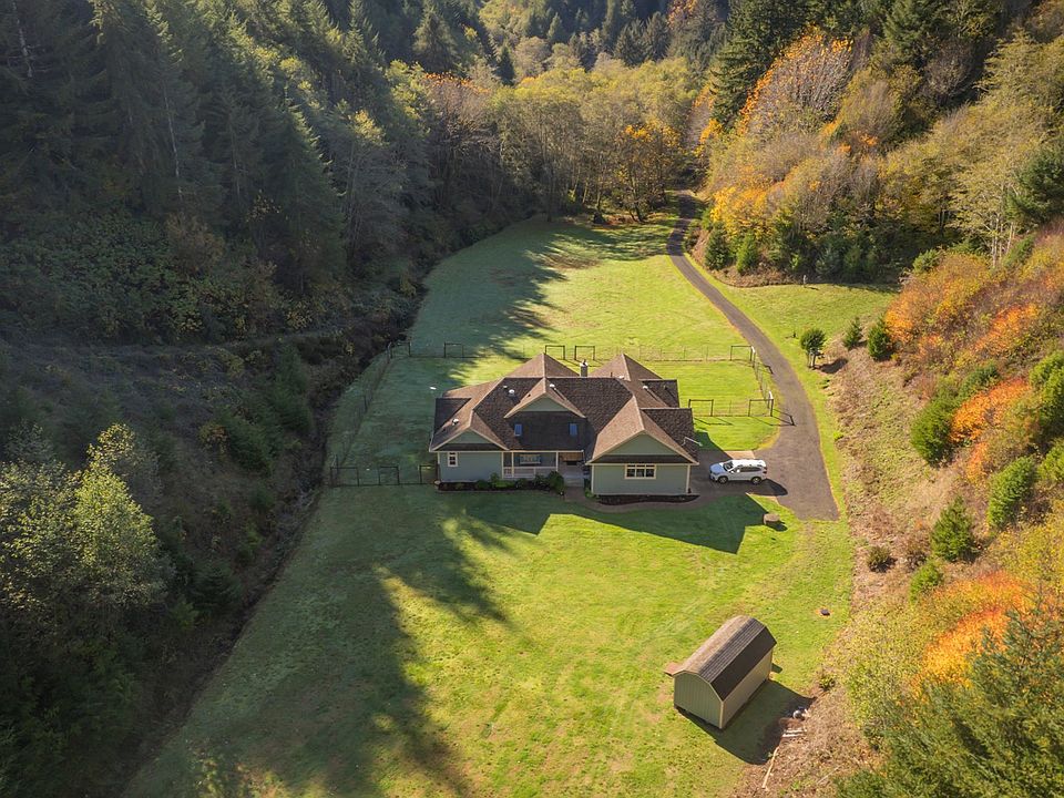 Tucked away on 9 private acres and embraced by 150 acres of pristine timberland, this exquisite custom-built home offers the perfect blend of seclusion and convenience just 3 miles from town. Designed with intention and crafted with care, the 3-bedroom, 2-bath residence welcomes you with a warm slate entry and soaring 18-foot windows that flood the open-concept living space with natural light. Rich hickory floors and open beam ceilings create a sense of rustic elegance, while solid CVG fir doors and custom cherry cabinetry add timeless sophistication. Warm up with the slate covered woodstove on those cold coastal mornings. The gourmet kitchen is a chef’s dream, featuring stainless steel appliances, Brazilian granite countertops, and thoughtful details throughout. Retreat to the serene primary suite or gather with loved ones in the expansive great room, where nature becomes your backdrop. The second bathroom has marble everything with radiant heated floors. Laundry room/ pantry has ample storage and large 2 car garage hides away all your outdoor toys. Beyond the home, the property is fully equipped for comfort and peace of mind: a 20KW automatic Kohler generator, two on-demand water heaters, a 1,000-gallon in-ground propane tank, and a hybrid heat pump ensure year-round efficiency. A secure gated entry, enclosed yard with electric fencing, and a 50-amp powered shed add both functionality and flexibility. Whether you're seeking a private sanctuary, a nature lover’s haven, or a refined rural lifestyle, this one-of-a-kind property delivers—offering beauty, privacy, and an abundance of amenities too numerous to list.