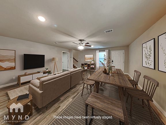 The first-floor primary bedroom has a walk-in closet and an attached bath with dual vanities and a tub/shower combo. Upstairs, you'll find two additional bedrooms and a full bathroom, providing plenty of space for family or guests.