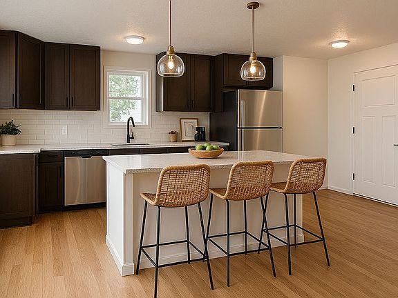 This thoughtfully designed new construction home offers the convenience of single-level living with a laundry closet located near the bedrooms for easy access. The open-concept kitchen and living area create a welcoming space for family and entertaining, featuring mocha cabinetry, under-cabinet lighting, and a dishwasher.