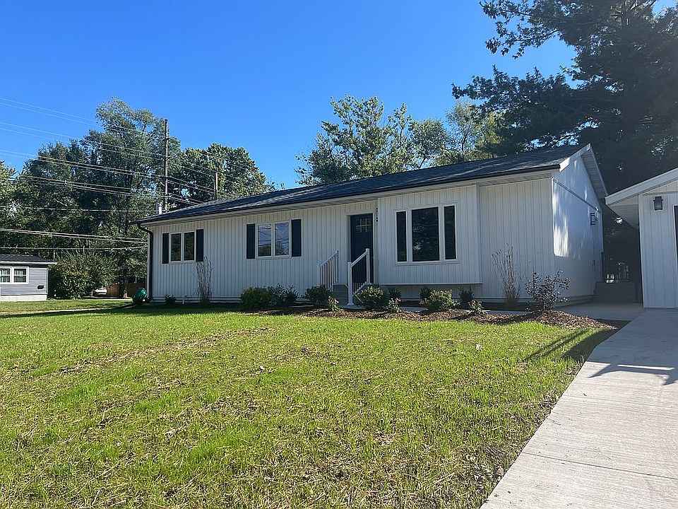 The home showcases modern farmhouse style with board and batten siding, black shutters, black seamless gutters, and black hardware. Inside, you'll find hardwood flooring, Pella windows, and an insulated crawlspace for energy efficiency and comfort.