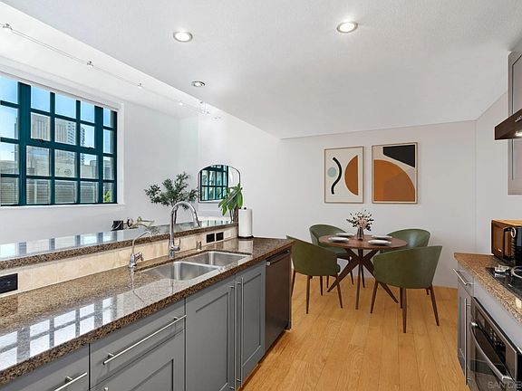1-bedroom, 1-bath condo at Electra, one of downtown San Diego’s most iconic and historic high-rise residences. With 656 sq. ft. of living space, soaring ceilings, and an open floor plan, the unit feels bright, airy, and inviting from the moment you step inside. The kitchen features granite countertops, a breakfast bar perfect for seating, and a clear view into the spacious living and family room. Premium appliances include a large GE refrigerator, Bosch oven and dishwasher, and a 4-burner gas stove. The bathroom is finished with elegant travertine, while hard-surface flooring flows throughout the home. Additional highlights include a newer stacked washer and dryer, and the option to purchase the unit fully furnished for a turnkey move-in. Electra offers a prime downtown location with easy access to Little Italy, the Harbor, Marina District, and the Gaslamp Quarter. Residents enjoy resort-style amenities including a luxurious social lounge, a stunning atrium with soaring 60-foot ceilings, pool, spa, fitness center, steam room, sauna, BBQ area, lush garden spaces, and 24-hour security. This is your chance to experience natural light, modern comfort, and timeless elegance in one of San Diego’s most sought-after towers.