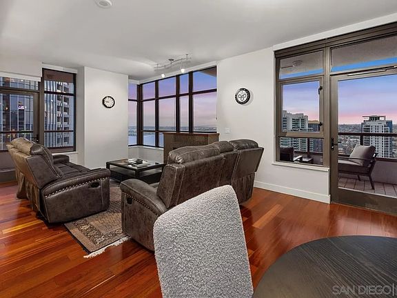 Behold a one of a kind exclusive retreat, perched majestically on the 35th floor of the iconic Electra, high above San Diego’s vibrant heartbeat. This coveted northwest-corner residence unveils a sweeping panorama of the bay and city skyline, as though the horizon itself were framed just for you. Step inside—and be captivated by lustrous Cherry hardwood floors that flow beneath expansive windows, flooding every room with radiant daylight. A cozy fireplace infuses the space with soft warmth and an intimate ambiance. Two balconies beckon—the western terrace your private stage for nightly sunset dance over the bay. Culinary artistry awaits in your gourmet kitchen, outfitted with stainless-steel Bosch and Thermador appliances, polished granite counters, and a chic breakfast bar perfect for casual gatherings. Outside your front door, the excitement of downtown life is yours to embrace—just a short stroll to Waterfront Park, Seaport Village, and the eclectic energy of Little Italy. Here, luxury is not an afterthought—it is a way of life. A dedicated concierge attends to your needs, serene steam room, resort-style pool and spa, and fully equipped fitness center await your indulgence. On the tranquil 5th floor, Electra Park and BBQ terraces offer serene garden escapes amidst the urban hum with two parking spaces flanking a built-in EV charging station and a private storage. Ascend to new heights—experience life among the clouds in a residence that effortlessly elevates luxury and lifestyle into one sublime experience. Must see!