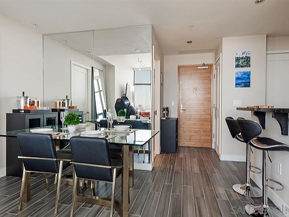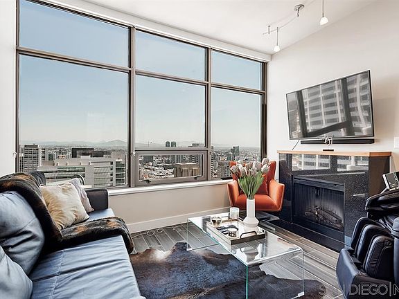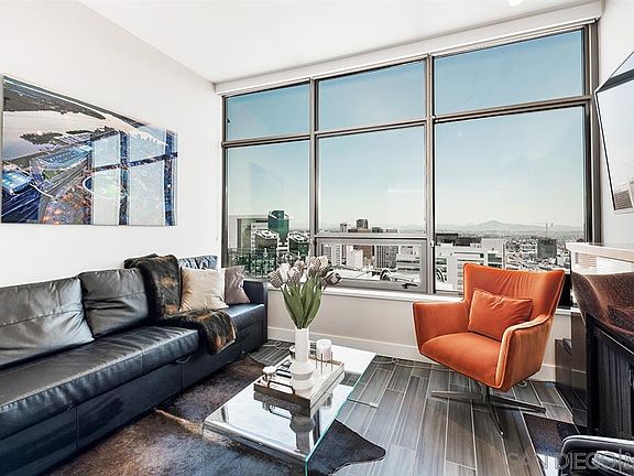 Beautiful condo with stunning views of Coronado Bridge, San Diego Bay, and city lights from the living room, balcony, and bedrooms . #3604 is located in the highly coveted high-rise Electra in the Columbia District of Downtown SD. Building is secure and private w/ concierge. Gourmet kitchen w/ stainless steel appliances opens to living space. Master bedroom has 2 walk-in closets, dual sinks and tub. Second bedroom has a walk-in closet and balcony access. 1 assigned underground parking spot.