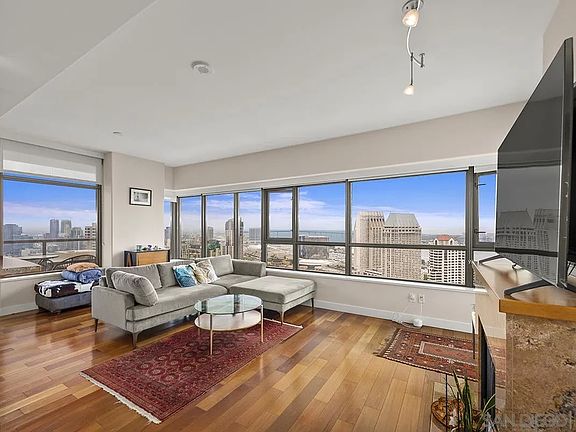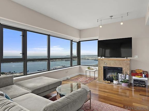 Experience unparalleled views of San Diego Bay and the cityscape from the 36th floor of Electra! This rarely available corner residence offers breathtaking panoramas stretching from Point Loma to the Coronado Bridge and beyond to the mountaintops. Imagine starting your day with a cup of coffee as the sun rises and winding down with San Diego's iconic sunsets from the comfort of your home. This high-rise residence features elegant hardwood flooring, electric fireplace with slab granite surround, and a private balcony, perfect for relaxing or entertaining. The open kitchen is a chef's dream, complete with premium stainless appliances, sleek granite countertops, convenient breakfast bar, and ample cabinetry. The primary bedroom is a sanctuary, boasting expansive windows, generous closet space, and a plush ensuite bathroom. The ensuite includes a soaking tub, frameless shower, and dual vanity. Additional features include stackable laundry, storage unit, and two side-by-side parking spaces. This stylish and functional home embodies metropolitan living at its finest!