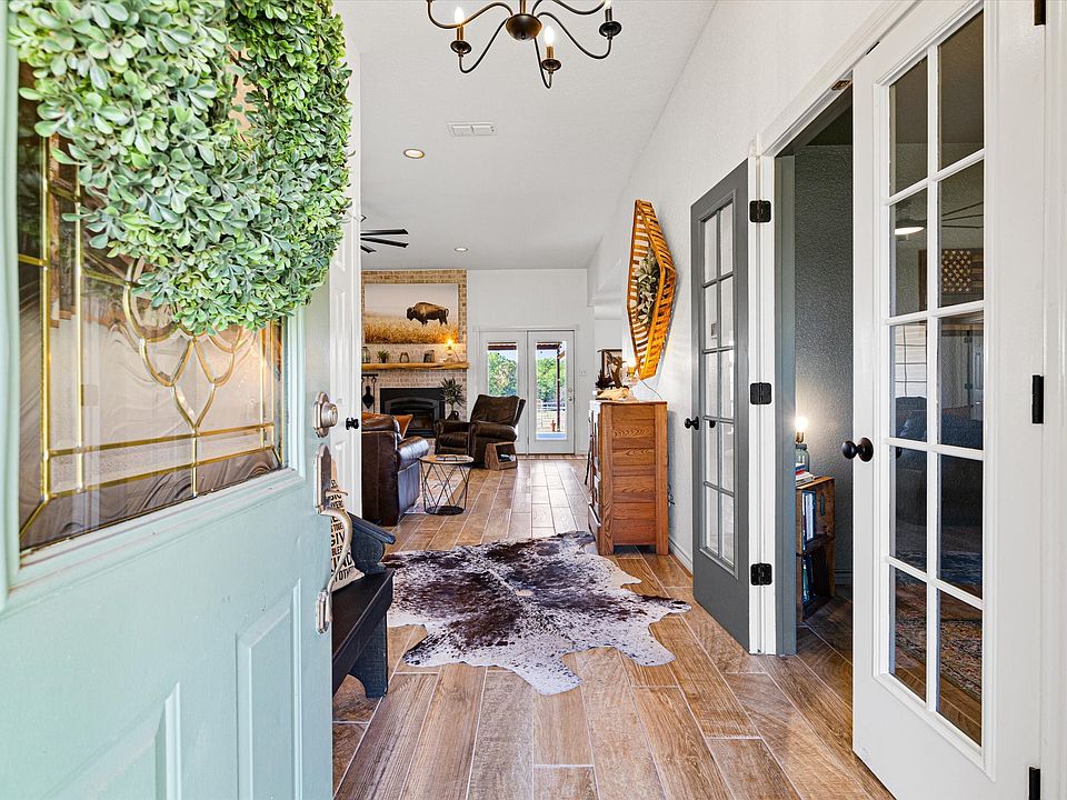 Bring your horses! This 5.9-acre AG-EXEMPT ranchette is move-in ready and offers incredible value with lower taxes. The remodeled brick ranch features 4 bedrooms, 2 baths, & a 2-car garage, plus a double covered carport for extra parking. Inside, the large living area boasts a wood-burning fireplace insert with fans that efficiently heat the room & help reduce utility costs. The pride of ownership is evident throughout the home, with fresh paint and wood-like tile in high-traffic areas.With a durable metal roof and a spacious 36x24 workshop, complete with electricity and LED lighting on automatic switches, this property is fully fenced and cross-fenced, including a stock tank and run-in shed—perfect for livestock. Enjoy outdoor living on the extended, covered backyard patio, featuring crank-down shades for comfort. Don’t miss this opportunity to enjoy country living at its best! Furniture pieces & emblements negotiable. All panels & chicken coop stay. Pasture accessible in 2 locations.