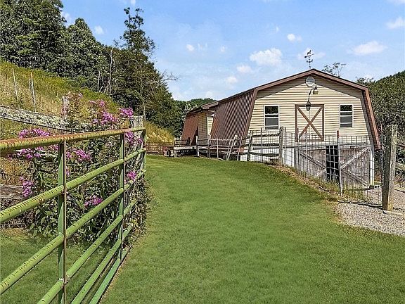 Nestled on a 16.574-acre mini horse farm offers a calm and peaceful setting with a Hemlock Timber custom built 3-5 stall horse Barn, tack room, bathroom, spring and stair that leads to a loft with open beams. 1344 sq ft 3 bedrooms, 2.5 bath Ranch home with full basement. Features include dining, living room (gas logs), den, owner's suite with bath/access to deck, laundry room, wood burning ducted furnace, monitor heater and garage/workshop area. Basement includes kitchen for canning/cellar for your preserved goods. Includes stove, refrigerator, dishwasher and washer/dryer.