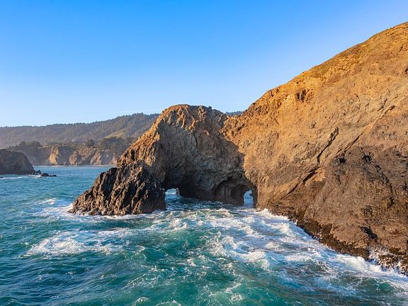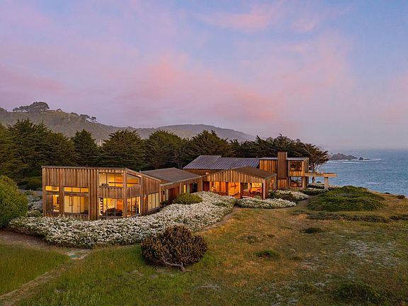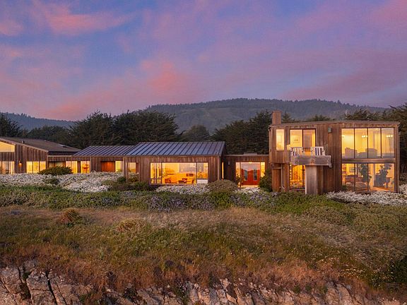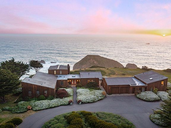 Set atop a secluded bluff overlooking Elk Cove, Sea Arches captures the essence of California's rugged coast across nearly 20 acres of pristine oceanfront land. Beyond a gated, cypress-lined drive off Highway 1 lies a striking modern residence of roughly 4,238 sq. ft., offering four elegant bedrooms and four tranquil baths. Designed to frame the Pacific from every angle, the home features sweeping glass walls, radiant slate floors, and a wood-burning fireplace that anchors the main living area in warmth and calm. A sculptural spiral staircase leads to an airy mezzanine and outdoor catwalk suspended above the cliffs, while the sleek kitchen and dining spaces seamlessly merge style with panoramic views. Connected by covered walkways, the guest quarters and additional ensuite bedroom ensure privacy and comfort. The property's landscaped trails wind through native vegetation and along nearly half a mile of dramatic blufftop, where turquoise waters crash against rock formations, including its own sea stack. Located near the village of Elk - hailed by Travel + Leisure as America's Best Small Food and Wine Town of 2024'' - Sea Arches is moments from Michelin-star dining, world-class Wine Country, and within easy reach of San Francisco and Little River Airport.