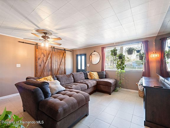This well-maintained home offers two bedrooms and two bathrooms, with two separate single-car carports—one positioned at the front and another in the rear that has been converted into covered storage—along with additional driveway parking for multiple vehicles. A welcoming open front porch and French door entry lead inside to a bright and comfortable layout, where beige ceramic tile flooring extends through the living room, dining area, and kitchen, while wood-look tile flooring is featured in the side flex room and real wood flooring enhances the bedrooms. The living room includes recessed lighting and ample natural light, flowing into the dining area and kitchen, which offers white cabinetry, porcelain tile flooring, stainless steel appliances including a flat-top range, a dual-basin sink, and a large pantry for extra storage. The spacious flex room, enhanced with a barn-style sliding door and French doors leading to the backyard, provides excellent versatility—ideal as a third bedroom, entertainment room, hobby space, or large enough to accommodate a pool table. The primary bedroom features real cedar-wood closets, a ceiling fan, a walk-in closet, and an en-suite bath with tile flooring, an updated vanity, and a walk-in shower, while the second bathroom offers a tub/shower combo with a ceramic tile surround. The laundry area includes overhead cabinetry for organization. Outside, the large open yard is accented by mature palm trees, a utility sink/fish cleaning station with hot and cold water, a covered rear patio perfect for outdoor cooking or gatherings, and a heated above-ground fiberglass spa for relaxation. A standout feature of this property is its private deeded access to a nearby spring-fed riverfront park, reserved for only a small number of local residents, offering a kayak launch, picnic areas, open green space, swings, a small boat ramp, and peaceful surroundings for nature watching, paddling, and leisure. Situated on a quiet, low-traffic street near Weeki Wachee Springs State Park, Pine Island Beach, Hernando Beach, and Rogers Park, this home provides convenient access to natural attractions, outdoor recreation, waterfront activities, and coastal sunsets while maintaining privacy and neighborhood charm.