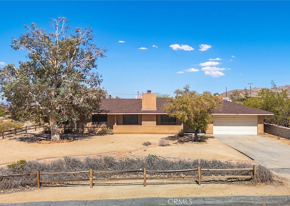 Looking for a lovely desert home or investment property with gorgeous mountain views? This spacious Indian Cove home is located just MINUTES from Joshua Tree National Park & features 1,674 square feet of living space with 3 bedrooms, 2 bathrooms & is nicely situated on .42 acres of land. Enjoy the comforts of this home's functional layout, dual cooling (AC & Evap Cooler) and charming appeal. The living room adorns warm wood-like flooring, high ceilings, a lovely wood-burning fireplace and large windows that let in an abundance of natural light. Just off the living room is a formal dining space which flows effortless into the kitchen area, complete with stainless steel appliances, tile countertops, bar seating & ample cabinet and counter space. The primary bedroom adorns an ensuite bathroom with a dual sink vanity and a spa-like walk-in shower. This home also has the added bonus of a convenient indoor laundry room and office space near the attached 2 car garage! Outside you'll be delighted to find a fully fenced yard with a large covered patio and plenty of space to entertain or relax around a fire pit on a starry desert night. Located in a quiet and desirable neighborhood less than 10 minutes from downtown and shops, restaurants, schools, cafes and more; all that's missing is you! Come take a look and fall in love; your new desert home or weekend retreat awaits.