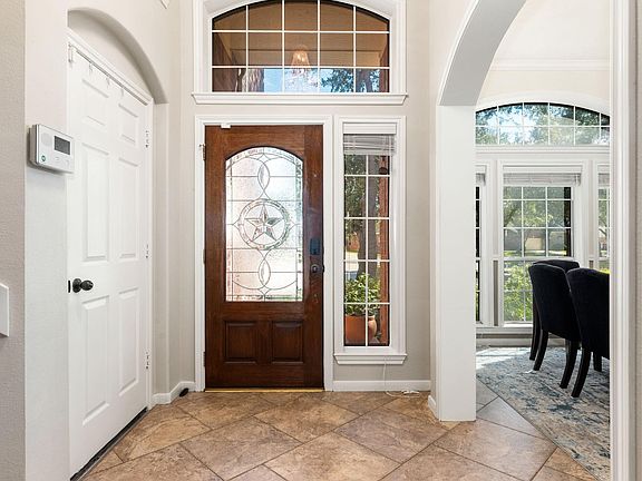 Beautifully maintained 4-bedroom, 2.5-bath home on one of Lakemont’s largest lots, tucked away on a quiet cul-de-sac. This elegant residence offers a functional layout with continuous tile flooring, decorative arches, crown molding, and custom lighting throughout. The kitchen impresses with quartz countertops, KitchenAid stainless steel appliances, double ovens, and a modern backsplash. A converted game room serves as a fourth bedroom, while the primary suite features double vanities, a jetted tub, and a separate shower for a spa-like feel. Enjoy a covered patio with screened storage and a spacious backyard ideal for entertaining or future outdoor projects. Major updates include a 2025 Trane HVAC system, 2022 roof, sprinkler system, and digital thermostat. Best of all, this home has never flooded—a rare find combining style, comfort, and peace of mind.