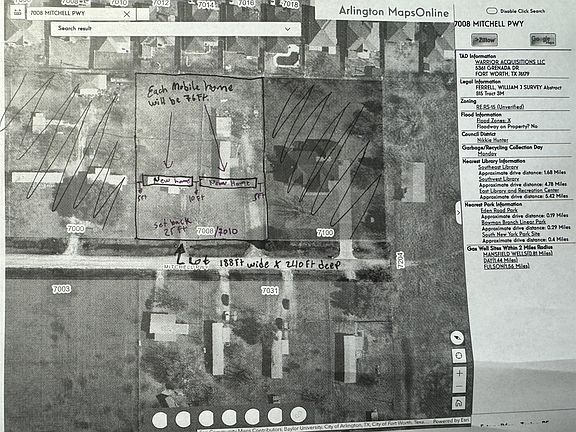 Rare opportunity to own over one acre in the heart of Arlington! This spacious 1.09-acre property is being sold as one combined lot (7008 Mitchell Pkwy), but it already includes a secondary postal address (7010 Mitchell Pkwy) offering flexibility to split the land if desired.