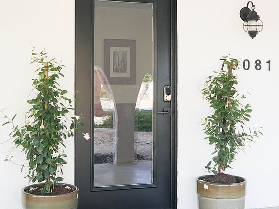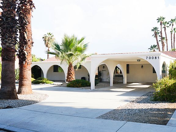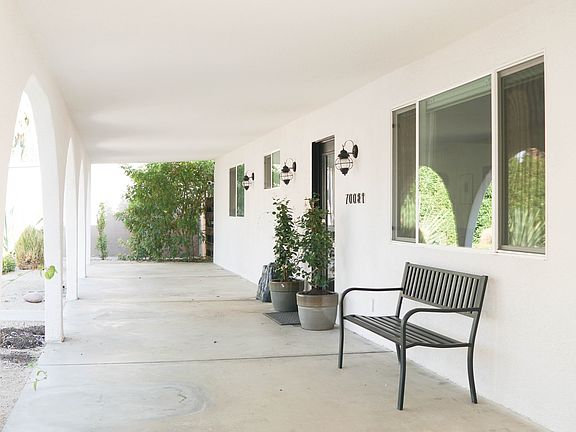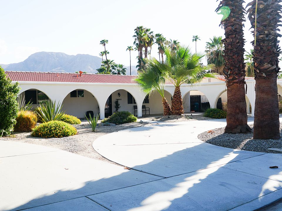 Located on a quiet street off of Da Vall Drive between Gerald Ford and Frank Sinatra. Beautiful low maintenance desert landscaping with matured Palm Trees. Home has contemporary kitchen with ocean grey granite counter tops, stainless steal appliances and elegant white cabinetry. Washer Dryer stackable combo located inside and is custom fit to size. This is a space saver. Living room is spacious and offers an open concept to dining area. Guest bathroom is contemporary style with lots of natural light. Master bedroom is cozy with large closet. Tile and wood flooring throughout the home. Windows and sliding doors are energy efficient. Accented with modern lighting. The rear of home offers shaded patio which encourages seating enjoyment of mountain views. Also has security system and tool shed. Centrally located to most everything the valley has to offer including wonderful walking trails and more.