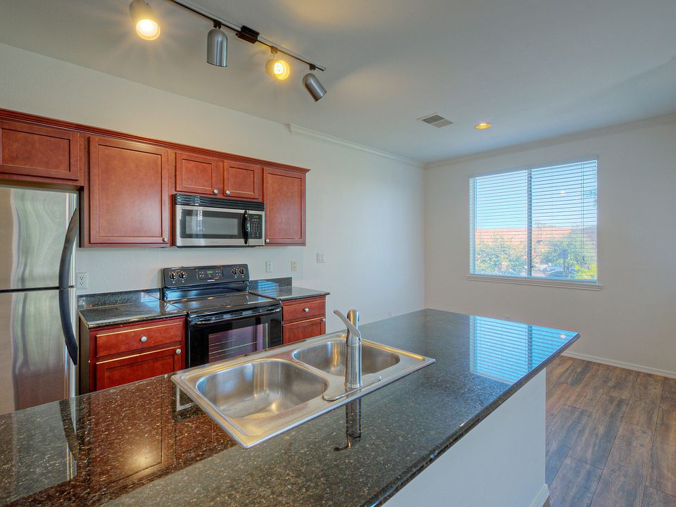 Unfurnished and remodeled, 1 bed 1 bath in the gated community of The Plaza Residences. Boston floor plan, which is the corner unit that has a private balcony, and private staircase to the front door. The corner units are brighter, with more windows and privacy. New wood flooring throughout (no carpet ) Master suite has a large walk in closet, with an adjacent full size washer and dryer. Kitchen has granite counters and stainless appliances, and the unit faces east. All appliances, and refrigerator included. One car, covered carport. Located just 2 blocks south of The Kierland Commons, which features upscale dining and shopping. Two pools, gym w/free weights, machines, treadmills, putting green, ping pong, conference room, jacuzzi, outdoor shower, poolside wifi. FAST MAINTENANCE, WALK TO KIERLAND COMMONS. $1485 per month.
