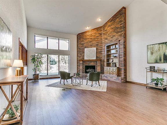 Location! Twin Lakes is convenient to NW EXPY shopping, restaurants, and services via MacArthur Blvd. Enter sought-after Twin Lakes driving by lakes open to fishing and picnicking for residents. Home! Entertain in the tastefully remodeled kitchen with granite, stainless steel appliances, center island, built-in hutch, and updated flooring with dining area opening to a cozy covered patio. View the manicured landscaping. A 2nd dining area is available for more formal occasions. Enjoy the dramatic two-story family room with floor-to-ceiling shaded windows, brick fireplace, & built-in bookcase overlooked by a 2nd floor living area. Relax on the main level and the primary bedroom suite with two walk-in closets and a private patio. Use the 4th bedroom as an optional study or exercise room. Need extra storage? A huge walk-in attic with flooring offers handy bonus space. Need extra parking? A circular driveway provides additional off-street parking separate from the side load garage - storm shelter included. Welcome to your Twin Lakes home! Listing agent is related to seller.