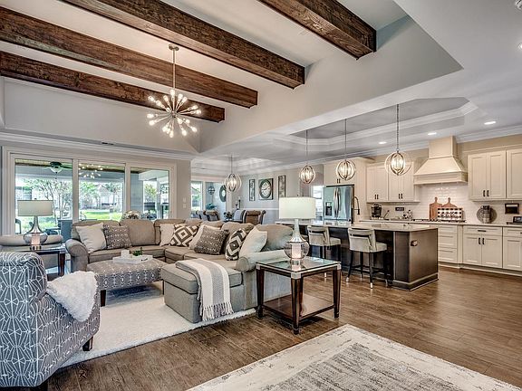 Single level living awaits in this immaculate Mediterranean style home, on a pond, adorned with luxury upgrades and finishes throughout. Meticulously maintained, exceeding the presentation of even newly constructed homes. The custom tile entry leads to a vaulted foyer with a beautifully detailed ceiling. The open floorplan includes the gourmet kitchen, large dining area, and spacious family room, all with ceilings adorned with trays, crown molding, and wood beams. The fireplace and cooktop are both propane gas powered. French doors lead into the office/study, handsomely topped with a coffered ceiling. The primary suite inhabits the entire left side of the home, with dual walk-in closets and a shower sure to be the envy of all who view it. The opposite side of the home provides three large guest rooms, one with a walk-in closet. Large laundry room and walk up attic storage. The custom tiled huge covered and screened veranda, and upgraded outdoor kitchen grilling area, overlook the beautifully landscaped backyard, where you can relax to the sound of the fountain in the pond. One of the screened sections raises and lowers via remote control. There is nothing but luxury touches throughout this home, from the porcelain tile flooring, plantation shutters, to the custom ceiling work throughout almost every room. If you are a discerning buyer, this is the home for you!