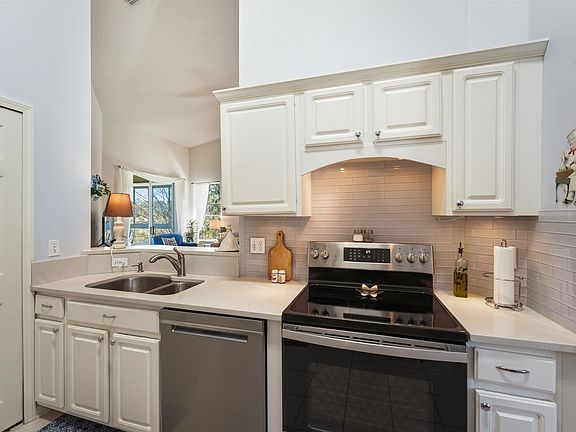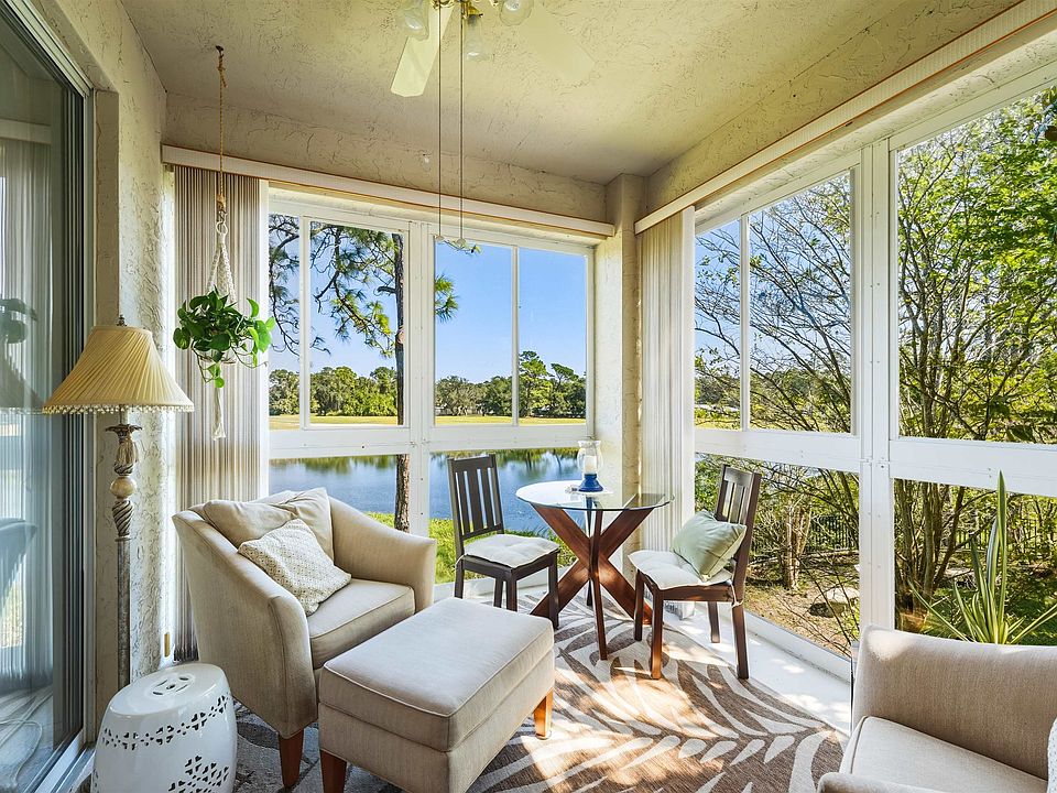 Welcome to this light filled, second floor condo offering one of the most beautiful views in The Greens. Extra side windows in this end unit fill the home with natural light, and the glass-enclosed lanai provides peaceful views of the pond, golf course, and surrounding greenery, just perfect for morning coffee or relaxing evenings. Inside, the vaulted ceilings and light, neutral decor create an open and airy feel. Luxury vinyl plank and tile flooring flow throughout the living spaces for easy maintenance. The kitchen features stainless steel appliances and a cozy breakfast nook, while the open living and dining area overlook the lanai and the stunning view beyond. The spacious primary suite includes a walk-in closet, open vanity area, private bath, and direct access to the lanai. A convenient closet just outside the front door offers additional storage. The Greens is an established and well maintained community with a sparkling pool and plenty of opportunities to meet neighbors. Residents of St. Augustine Shores also enjoy scenic walking paths, parks, a fishing pier, clubhouse, RV/boat parking, and access to the public golf course. Located just minutes from shopping, dining, Historic Downtown St. Augustine, and the beach! You will love the serenity and lifestyle of this condominium home!