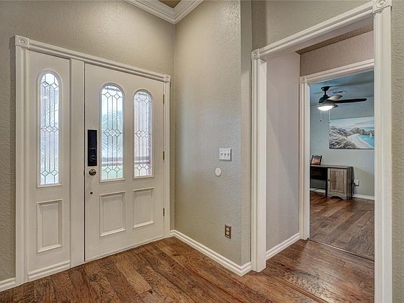 Make this incredible show stopper yours today! The floorplan encompasses a true 4-bedroom & an optional 5th bedroom or office/flex living space. This amazing home is sure to please from the stunning curb appeal to the amazing features throughout. As you enter you are greeted w/beautiful warm wood like flooring & neutral color palette throughout. The Living area boasts a beautiful Fireplace flanked by built-in shelving & storage cabinets. The kitchen is fit for a chef & very spacious w/lots of countertop space, high-top breakfast bar + storage. The master suite is generous in size w/cathedral style ceiling & recessed lighting. Enjoy bubble baths in the spa-like master bath showcasing a large soaker tub, separate shower & double sink vanity. In addition, this home has very large utility room w/countertop & sink. The HVAC was replaced in January 2023 & added a Reme Halo Air purifier on it. The ducts were cleaned in 2020. There is an above/underground storm shelter in the backyard!
