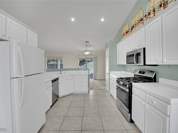 Charming 3 bedroom, 2 bath single-story home with an open floor plan and vaulted ceilings! Convenient location near freeway, shopping center, and schools. AC unit and water heater were both replaced about five years ago, added BENEFIT for new owners! Recently UPGRADED GE stainless steel appliances in the kitchen that are approximately two years old (range oven, microwave/hood, and dishwasher). Tile flooring at front entrance and wet areas. Ceiling fans in the dining area and family room. Bedrooms have vaulted ceilings! Primary bedroom has a spacious walk-in closet with ensuite and double sinks, bathtub, and shower. Desert landscaping in front and backyard. Backyard has a covered patio! PLUS refrigerator and washer & dryer are all included!