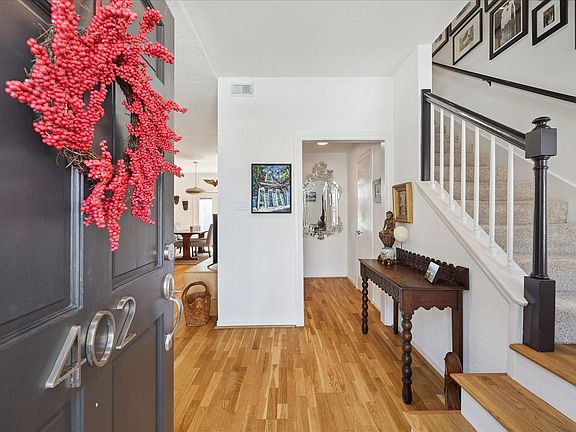 Wood burning fireplaceHome officeFloor to ceiling windowsHardwood floorsNew cabinetsBrick patioStainless appliances
