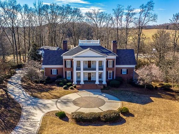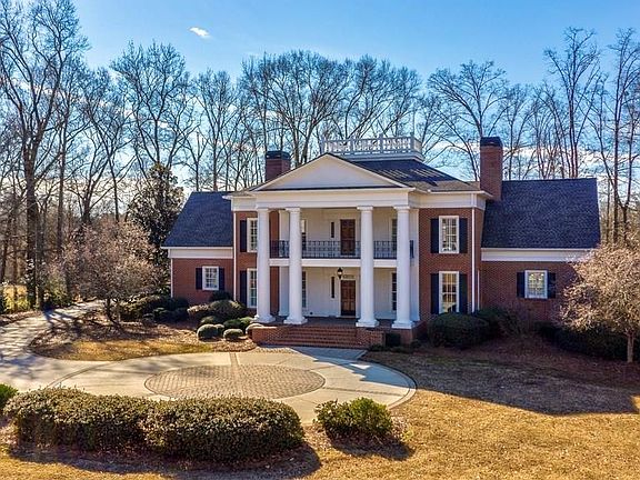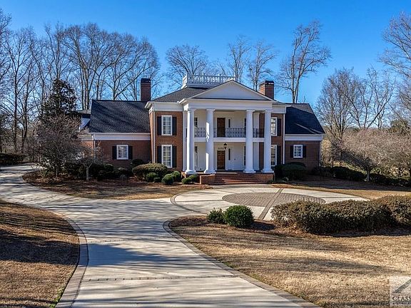 Amazing Georgian architecture abounds in this recently renovated elegant Southern Estate with new roof and gutters, 2 home offices, 10 ft. ceilings, double balconies and stately white columns. Upon entering the grand two-story marble foyer with its curved custom wrought iron and marble staircase, you will be in awe of the architectural details. The wrought iron railing outlines two upper balconies, one of which overlooks the foyer and family room. The marble flooring features a center mosaic and extends into the formal dining room. The handsome study features cherry Judge's paneling and matching floor to ceiling bookshelves to create the perfect work retreat. A cozy fireplace compliments this handsome home office. The gourmet kitchen provides an abundance of granite countertop space, custom cabinetry finished with intricately carved borders and a large center island. The refrigerator and dishwasher doors are paneled to blend in with the cabinetry and to help accent the high end stainless steel appliances. The two-story family room is anchored by a beautiful marble fireplace and multiple access points to the rear paver patio. An abundance of natural light makes this a phenomenal living space, and it overlooks the well groomed golf course. The extra large master suite, with marble fireplace, is adjoined by a beautiful spa bath and huge walk-in closet with cherry stained built-in cabinetry providing an abundance of hanging space and drawer space in the closet island. The second level features another master suite with a separate sitting room w/ marble fireplace, and en suite bath. The closet for this upstairs master is exceptionally large, and could double as an upstairs workout room. Two additional bedrooms are located upstairs, as well as an extremely large finished bonus room over the 3 car garage. The cherry glass display cabinets with interior lighting span an entire wall in the bonus room and were custom designed to showcase any type of memorable collection. The partially finished terrace level has a theater room with theatre seating and red and black acoustical suede covered walls. A 100+ inch built-in theater screen and all theater seating convey with the home. An exercise room with full bath has also located in the terrace level, and can be used as an additional guest suite. The Georgia Club offers members 27 holes of golf, two pools, 6 clay tennis courts and a club house with fine dining.