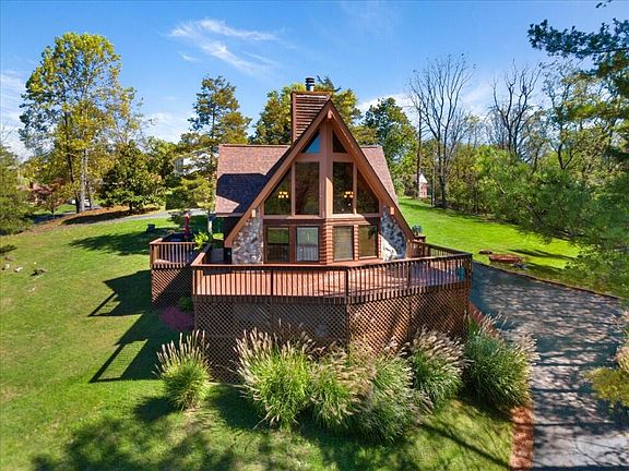 One owner, custom built A-frame shows pride of ownership inside & out with an effortlessly flowing layout, soaring high vaulted ceilings, gas log fireplace and incredible wrap around deck! Freshly sealed driveway ascends past towering trees & quality landscaping creating an alluring first impression to your first stop, and new favorite spot, the 900 sqft deck showcasing wonderful neighborhood views. Enjoy al fresco dining, container gardening or basking in the sun, plus the many large windows let you know the interior will be illuminated with so much natural light! Stunning living rm where the high vaulted ceiling & cozy fireplace set the scene for comfortable everyday living & entertaining. Kitchen loaded with cabinetry & counterspace.