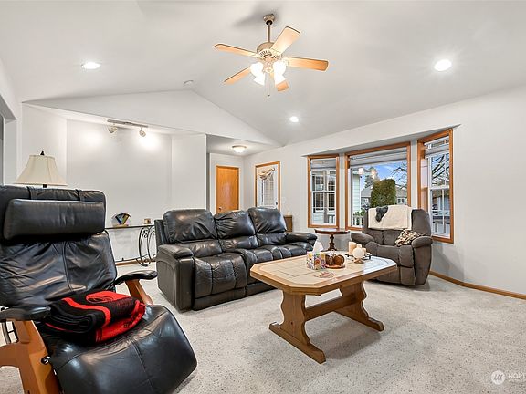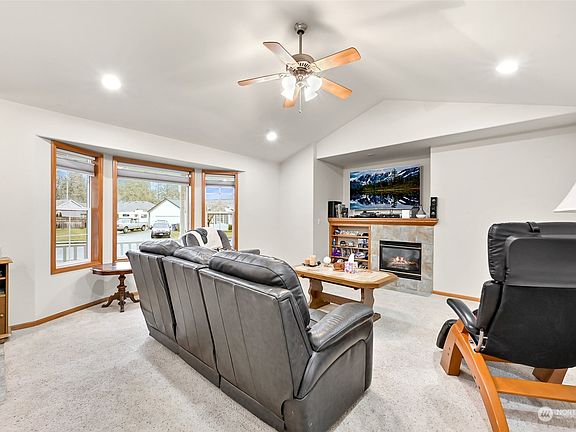 Convenient single-story living in Lynden! Set on a large lot, this open-concept home features vaulted ceilings, large windows, custom cabinets + built-in shelving throughout, & central AC. Living room with cozy gas fireplace, spacious kitchen with modern tile backsplash + sunny dining area, & a versatile formal dining area/flex space. Head back to a full bathroom, & 3 good-sized bedrooms including the primary suite with coffered ceilings, walk-in closet, dual vanities, full-height shower, & jetted soaker tub. Outside is the private backyard with 16x14 Trex deck, flower beds, automatic sprinkler system, & a fully-insulated/heated detached shop with cable hookup. Attached 2-car garage, covered front porch & near downtown Lynden. Welcome Home!