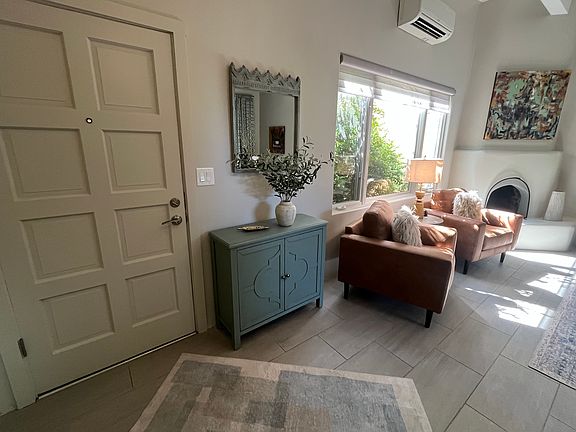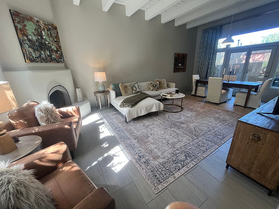 This lovely modern furnished 1 bed, 1 bath, with 2 kiva wood burning fireplaces, offers a large master suite with sitting area, an enclosed private court yard, located in a premier location on E Alameda close to downtown Plaza, Galleries, shopping and hiking. New modern sunlit kitchen with stainless steel appliances. Microwave. Gas cook top, washer, dryer and pantry. Fully furnished available for immediate move in. Radiant heat. Split units a/c. Off street parking.