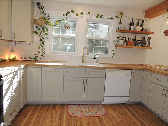 Welcome Home to this updated cottage conveniently located near downtown Mocksville. This adorable 2 bedroom / 1 bath cottage features an open floor plan with great space. Original hardwood floors in Living room and bedrooms. Modern laminate flooring in kitchen, bath, and dining room. The kitchen features recent soft-close cabinets with butcherblock countertops and smooth top range. The large laundry room and 14 x 9 screened porch is not included in square footage. HVAC new in 2025 and roof replaced in 2020 or so. Outside entry cellar has room for storage along with the 20 x 20 outbuilding. The lot is level .65 acres with a firepit for enjoyment. Make plans to schedule an appointment for this one.
