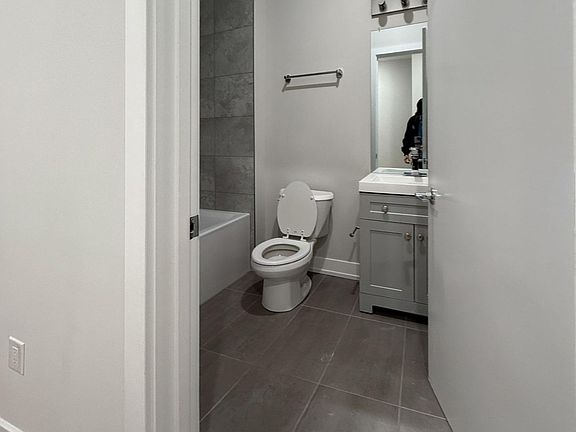 Both bathrooms are tastefully appointed. One bathroom features a bathtub with marble-like tiling and a decorative mosaic strip. The other bathroom showcases a modern vanity and a sleek design.