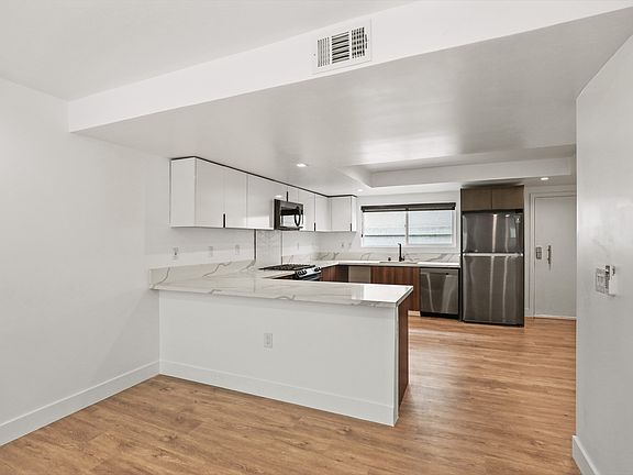 The apartment homes are separately-metered, fully parked with six onsite parking spaces and have central air conditioning. Creatively designed by a renowned LA designer, these 1970 vintage luxury rental homes feature keyless entry door locks to spacious one and two-bedroom floor plans with newly upgraded kitchen and bathrooms. The kitchen boasts sparkling white stone quartz countertops with brand new self-closing bamboo enhanced cabinetry and high-end stainless-steel Whirlpool refrigerators with matching gas cooktop with oven and microwave. Each rental home has porcelain tiled bath tubs and glass shower doors with oversize vanity mirror. Each rental home also includes central A/C cooling and heating with recessed lights with luxury style remote control blinds and distressed wood plank floors.