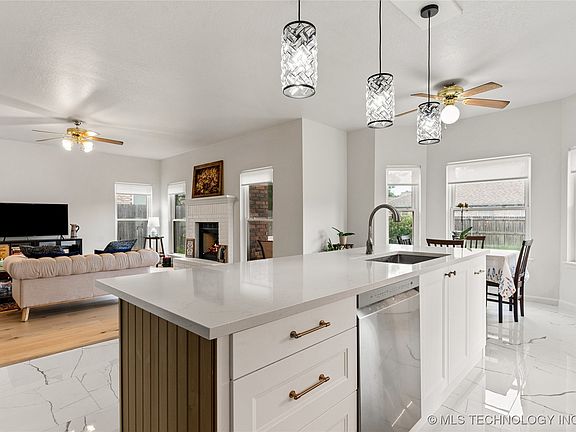 Discover your dream home in Broken Arrow's desirable 74012! This stunning 4-bedroom, 2.5-bath residence boasts meticulously renovated living space. This home underwent extensive, high-quality renovations in 2023–2024, ensuring a perfect blend of classic appeal and contemporary luxury. The heart of the home, a gorgeous new kitchen, features modern tile flooring, custom cabinetry, a large center island, quartz countertops, and all-new stainless steel appliances (refrigerator, dishwasher, vent hood included!). Enjoy the elegance and ease of premium engineered hardwood floors in all living areas, the stairway, and every bedroom—absolutely no carpet! Bathrooms have been beautifully transformed with fresh tile, updated vanities, quartz countertops, stylish sinks, mirrors, and lighting. Fresh designer paint in light, neutral tones creates a welcoming ambiance throughout. Enhanced comfort and safety are assured with new smoke alarms, a smart Ring doorbell, and two security cameras. Major mechanical updates include a 2022 roof and 2018 HVAC. The bright, open floor plan flows seamlessly, highlighted by a cozy family room with a modernized fireplace. Conveniently located minutes from top-rated schools, shopping, and parks, this home offers exceptional convenience and community living. The backyard provides excellent space for entertaining, gardening, or play, complemented by a 2-car garage and ample driveway. This home was not a flip or quick fixer-upper. All renovations were thoughtfully completed by the sellers for their personal use, with high-quality materials and attention to detail throughout. The property is being offered for sale due to a job relocation—not by choice—making this a unique opportunity to own a truly move-in-ready home that was lovingly maintained and upgraded!