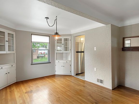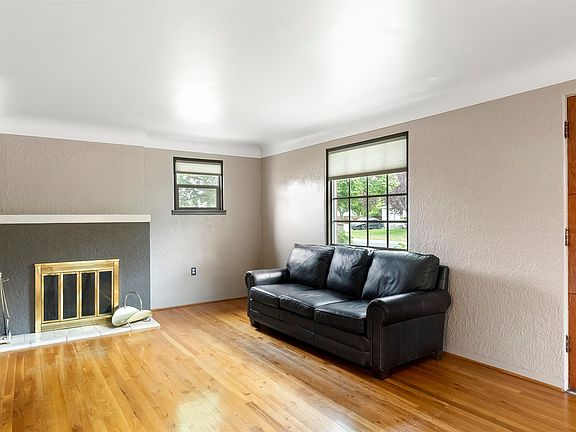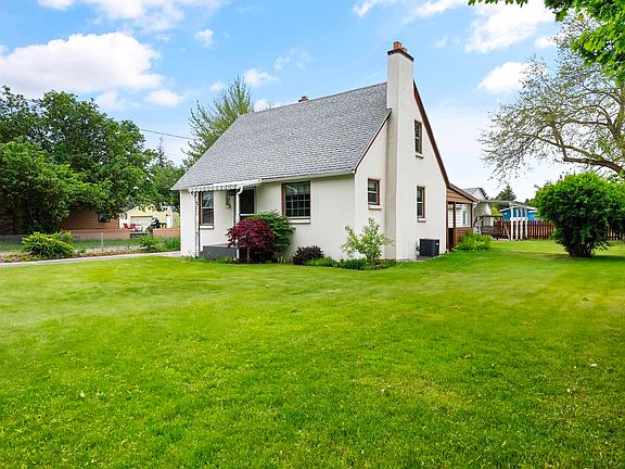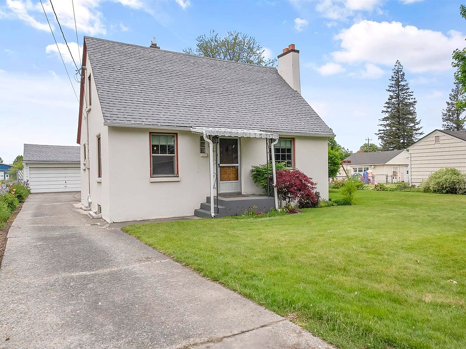 Don't miss this charming 1-1/2 story home in terrific Spokane Valley location. Features original hardwood floors, coved ceilings, formal dining room with built-ins, stainless appliances and two fireplaces. Upstairs has 2 bedrooms, wood floors and full bath. Enjoy updated vinyl windows and high-efficiency gas furnace with A/C. Chimney cleaned in 2023. Spacious basement family room has newer LVP flooring with easy 4th BR that can be added. You'll love the oversized covered patio and backyard on this large lot. The 2 plus car detached garage has its own electric sub-panel and covered carport. Terrific West Valley schools.