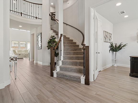 This beautifully designed Perry home offers luxury and comfort across two spacious stories. A grand rotunda entry welcomes you with a curved staircase, setting the tone for the home's elegant layout. The formal dining room and private home office with French doors frame the entrance, creating a refined first impression.