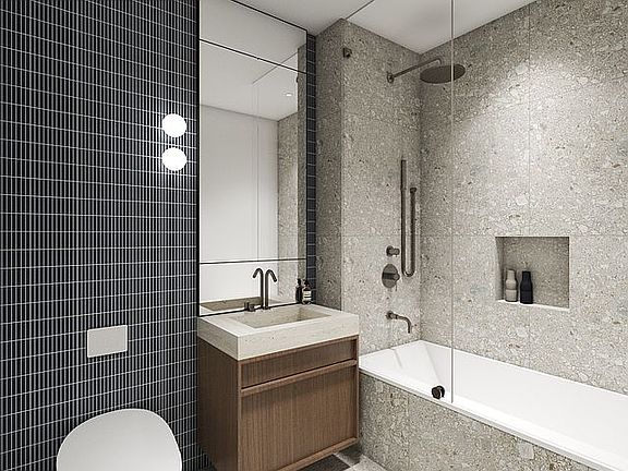 All three bedrooms feature floor to ceiling eastern facing windows and face the terrace. The king-size primary suite leads out to the terrace and features a walk-in closet and a pristine en-suite bathroom with large-format Prissmacer porcelain tiles, a custom Lucena Bath double vanity, a mirrored medicine cabinet, Artos fittings, and a walk-in rainfall shower. The second and third bedrooms have reach-in closets, and the second bathroom has a deep Duravit soaking tub with shower.