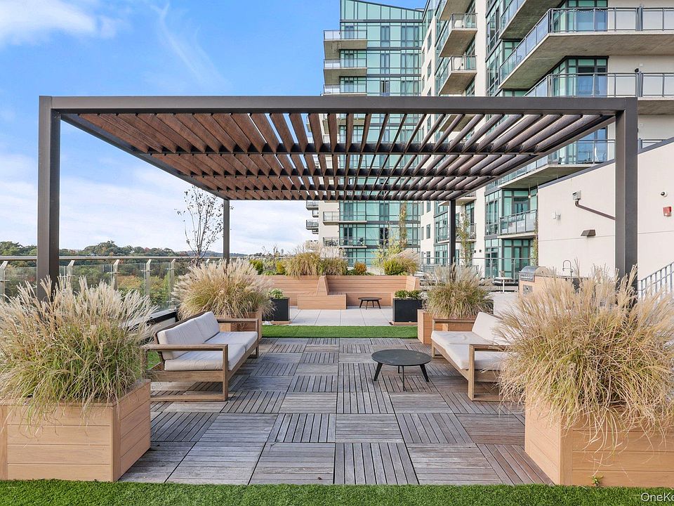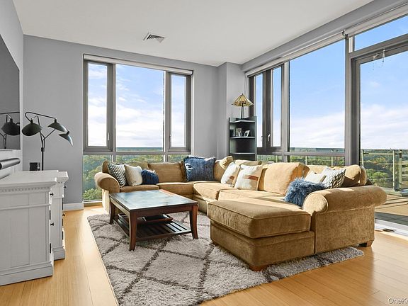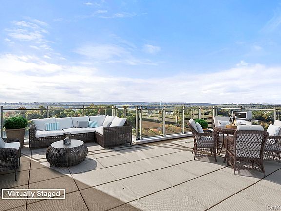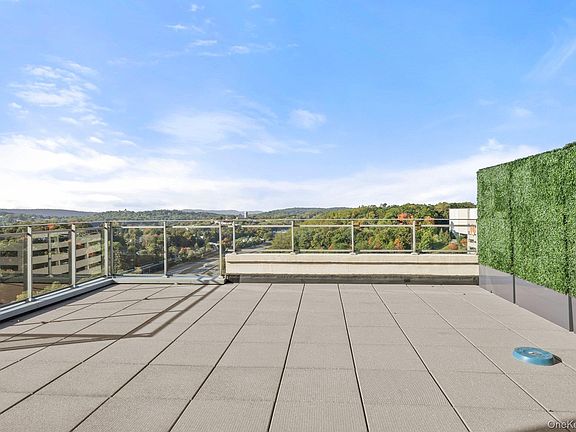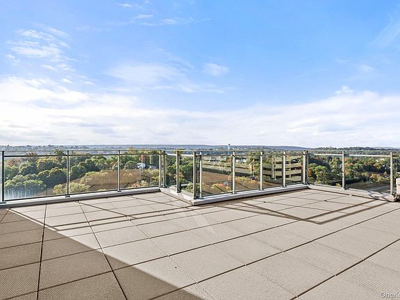 Beautiful Penthouse featuring an open concept with walls of windows, 2 large bedrooms, 2 full baths & huge 670 sq ft private roof-top patio with spectacular views. This top floor, corner unit provides amazing natural sunlight with floor to ceiling windows, 10 ft ceilings, a spacious living room with access to the patio and open to the kitchen w/breakfast bar, stainless steel appliances & quartz counter-tops with gorgeous hardwood floors through-out and in unit washer/dryer. The primary bedroom suite features a brand new renovated en-suite bathroom with fantastic storage and closet space. The Monarch is a full service luxury building which includes a 24hr concierge, resident lounge, an amenity bldg featuring state of the art fitness center, running track, indoor basketball court, pool, hot tub, sauna, cinema, event room and outdoor areas complete with bbq's and complimentary shuttle to Metro North. This unparalleled location provides amazing convenience just steps from the Ridge Hill shopping center, Whole foods, great restaurants and shops including Lowes home center. Less than 30 minutes from Manhattan and easy access to major highways, it is an easy place to call home.