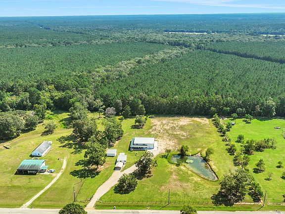 Nestled on a tranquil 5-acre tract, this impressive 3,600 sq. ft. barndominium blends modern luxury with rustic charm and includes a private stocked pond. Built in 2022, the 2-story design offers an open concept, 3 spacious bedrooms (with potential to convert to 5), stylish finishes, and generous living space. The chef’s kitchen features butcher block countertops, a large island breakfast bar, gas range, butler’s pantry, and oversized walk-in pantry. The huge primary suite includes a sitting area, walk-in closet, and a beautiful bath with stylish tile and a gorgeous shower. A phenomenal 3-sided wraparound porch is ideal for relaxing or entertaining. Upstairs, a gameroom offers endless possibilities along with a full bath and 2 large secondary bedrooms. Additional highlights include a cinder block safe room and Generac generator. Fully fenced, backing to Sam Houston National Forest, plus an adorable 672 sq. ft. guest house that’s stylish, move-in ready, and income producing. MUST SEE!!