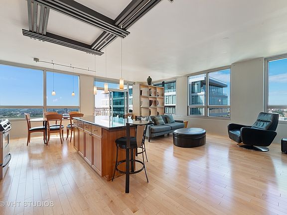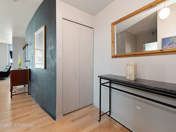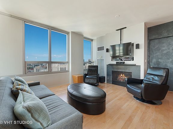 Beautifully upgraded high-floor corner 2BR condo in coveted Wells Street Tower with stunning skyline & river views! Perfect walk-score location just blocks to the Loop, West Loop & South Loop. Great natural light thru tons of large thermal pane windows w/ preferred south/west exposure. Tall 9' ceilings & solid concrete construction. Modern open layout w/ new maple HW floors, separate dining area, toasty gas fireplace & convenient balcony. Stylish kitchen w/ 42" cabinets, oversized 1.25" granite island & KitchenAid stainless steel appliances. Spacious master suite w/ walk-in closet & renovated spa bath w/ dual vanity, exotic stone tile & whirlpool tub. Generous 2nd BR w/ wall of built-ins plus another updated bath w/ chic tile details. New washer/dryer & tall storage locker. Prime garage space #24 +$30K. Full amenity bldg. w/ doorman, gym, sundeck & more. Assessments incl: gas, heat, AC, cable & internet! Easy lake, park & train access. Move-in ready!