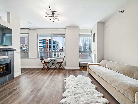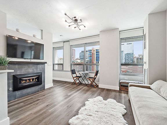 This fully remodeled 1 bedroom, 1 bath unit in Wells Street Tower combines minimalist design with efficient use of space. It features new 6" baseboards, custom paneled doors, and an open floor plan that offers stunning east-facing views of the city. The remodel includes wide plank flooring, custom lighting, and a modern kitchen equipped with shaker-style white cabinets, quartz countertops, tile backsplash, new appliances, under-cabinet lighting, and a breakfast bar. The living area boasts large windows, a mounted TV, and a contemporary gas fireplace. Also included are a side-by-side washer and dryer. The bathroom has been upgraded with large floor tiles, a custom vanity with ample storage, high-end faucets, and an extra-deep whirlpool tub. A Wi-Fi-enabled Nest thermostat enhances convenience. The building itself has newly refurbished amenities including the lobby, fitness center, community center, yoga room, and resident's lounge. Pet-friendly and ideally located near shopping, dining, the water taxi, METRA, river walk, entertainment, and the Roosevelt Collection Retail Center. Ready for move-in with no further work needed.