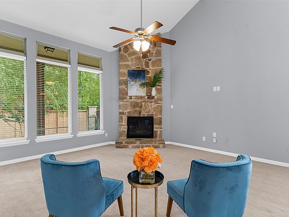 New listing with dramatic 18ft ceiling & stone fireplace on a quiet cul-de sac lot with no homes behind for privacy. Fabulous floor plan with primary & study on the main level, 3 bedrooms, 2 baths and large game room up. Quartz kitchen boasts a large island and a wall of extra cabinet storage. New carpet in living & primary, new dining & coach fixtures. This is Trinity Falls, a vibrant 2,000-acre master planned community where natural beauty and exceptional amenities combine to create a spectacular lifestyle. Just minutes from downtown McKinney shopping, dining and fun, Trinity Falls offers open green spaces, a 350 acre nature park with miles of winding river frontage, forested trails and opportunities to connect with neighbors and friends. There is something for everyone at The Lodge with its pool, fitness room, event space, and catering kitchen. The Club with its beach-entry pool, splash pad, grilling area, tricycle track and playground. The Old Joe Dog Park provides canine fun in the sun. Combined with engaging amenities and a robust activity calendar, there is ample opportunity to connect. Fishing lakes, an amphitheater for special events and even an 18-hole disc golf course. Nearby is Basecamp, offering residents another splash pad, playground and outdoor pavilion that plays hosts to concerts and other activities. Top rated McKinney schools and Frazier Elementary within the neighborhood. Agent lives close by and can show the property on short notice. Live the Trinity Falls resort lifestyle every day.