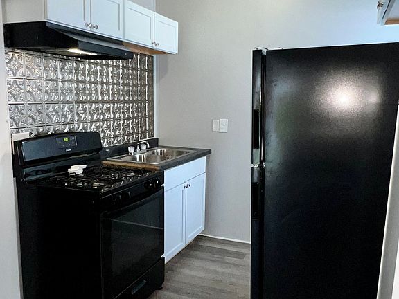 - Full-size black appliances including gas range and refrigerator