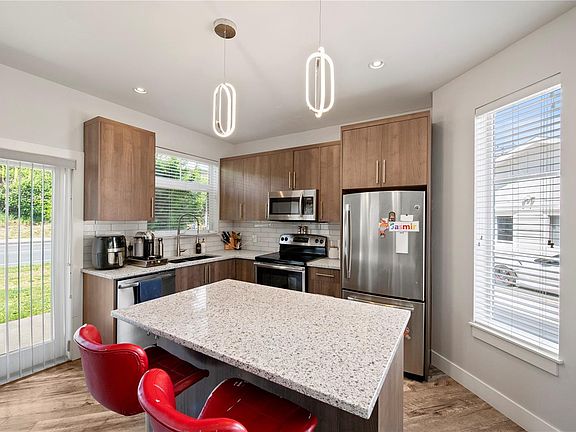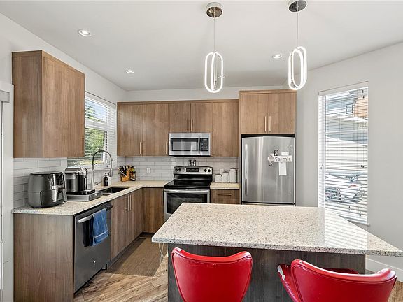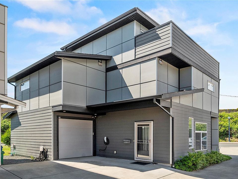 Modern Living with a Rooftop Retreat Experience contemporary style and effortless living in this 3-bedroom, 3-bathroom home with a versatile flex space and an impressive 315 sq. ft. rooftop patio. The open-concept main level features soaring 9-foot ceilings, oversized windows, and a bright, airy layout designed for both everyday comfort and entertaining. A sleek kitchen with quartz countertops and stainless steel appliances flows seamlessly into the living and dining areas, while French doors extend the space to a fully fenced yard and patio—perfect for indoor-outdoor living. Upstairs, the rooftop patio becomes your private sanctuary, ideal for lounging, hosting, or even adding a hot tub for year-round enjoyment. Solid laminate flooring, underground sprinklers, and low-maintenance finishes make upkeep simple. Ideally located close to shopping, dining, transit, and just 20 minutes to downtown Victoria, this home offers the perfect blend of style, function, and convenience.