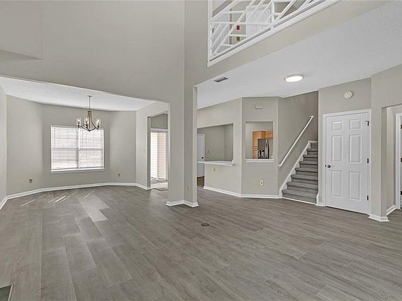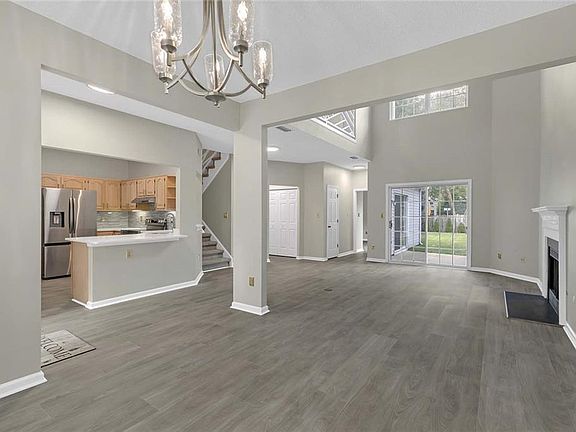 Gas fireplaceNew lvp floorOpen floor planCustom kitchenNew paintSoaring cathedral ceilingsQuartz countertops