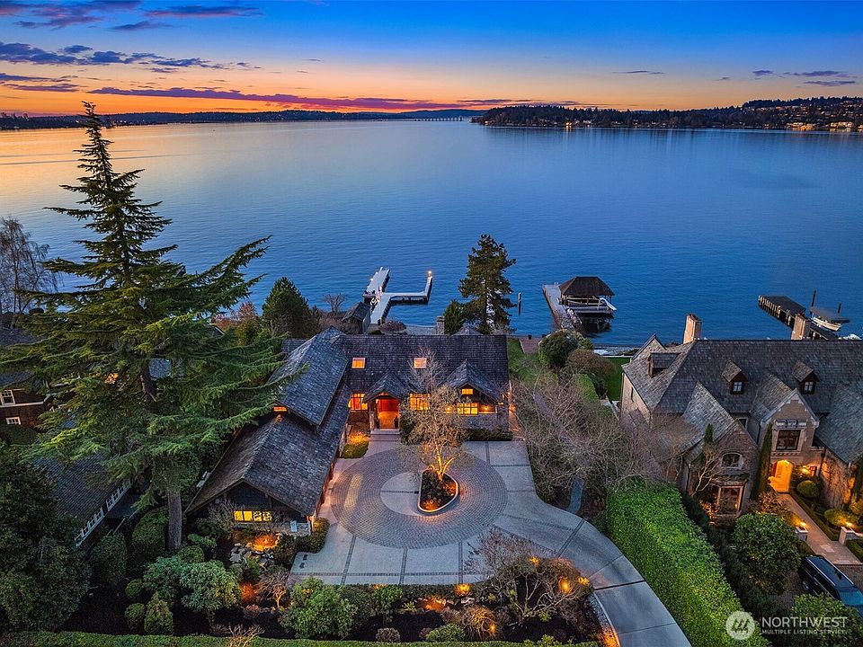 Taking its place among the most significant estates on Mercer Island, this rare waterfront offers 85 feet of lakefront in one of the Island’s most sought-after locations: The North End. The quiet, serene, expansive view sweeps from golden sunsets over Seattle in the west to the twinkling Bellevue skyline and majestic Cascades in the east. Over 7000 SF of living space including main floor primary suite with a front row to the view. Timeless Northwest design with heavy timbers & incredible craftsmanship all meticulously maintained by the owner. Resort living at its best: entertain poolside or at your private beach overlooking the 180-degree view. Fabulous auto court for easy parking. Rebuilt deepwater dock for ~100’ yacht & rare boat house.
