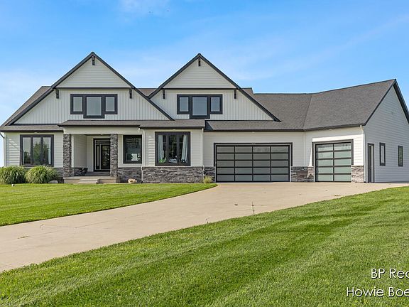 Welcome to your dream home on 5.26 serene acres in Zeeland! This stunning 5-bedroom, 3.5-bath modern farmhouse blends luxurious finishes with everyday comfort. The open-concept main floor features expansive windows, a sleek fireplace wall, and a gourmet kitchen with oversized island, quartz counters, and premium stainless appliances. The main floor primary suite offers a spa-like bath, dual vanities, and a walk-in closet. Upstairs you'll find spacious bedrooms with walk-ins, while the finished lower level boasts a rec room, gym space, and guest suite. The oversized 3-stall garage fits up to 5 cars, perfect for extra storage or toys. Enjoy peaceful views from the covered patio and the endless possibilities that come with over 5 acres. Located in Zeeland Schools, this home offers privacy yet is minutes from town, shopping, and highways.