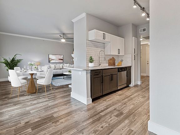 - Exterior features: 6 Panel Doors, 6 inch baseboards, Backsplash, Black Appliances, Bookshelves, Brushed Nickel Fixtures, Built-In Computer Desk, Ceramic tile backsplash, Crown molding, Entry closet, Espresso Cabinets, Garages, On Call Emergency Maintenance, Package Receiving, Pet Park, Private Access Garages, Smart Home System, Spruce Lifestyle Services, Stainless steel appliances, USB Port, White Quartz/Undermount Sink, White/Gray Cabinet Combo, Wood Style Flooring