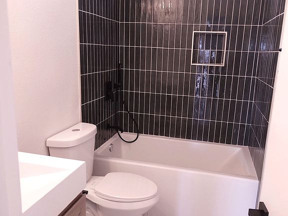 The bathroom is a modern oasis, complete with a rain shower, bathtub, sleek vanity, and contemporary tile finishes. Plus, the in-unit washer/dryer makes laundry effortless.