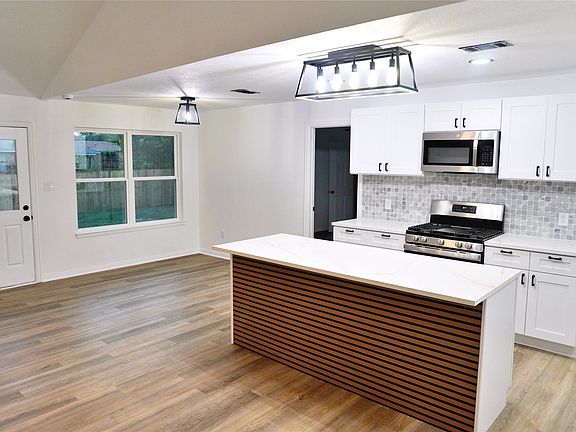 This elegantly remodeled residence features 3 bedrooms, a private office with French doors, and 2 full bathrooms with high-end finishes in established neighborhood. The open kitchen layout features marble QUARTZ countertops, NEW white cabinetry, and brand-NEW stainless-steel appliances including a gas range, microwave, and dishwasher. Vaulted ceilings, a floor-to-ceiling brick fireplace, recently UPGRADED energy-efficient windows, and NEW Luxury Vinyl Plank (LVP) flooring throughout the house enhances the modern living space with abundance of natural light. The owner’s suite includes a custom walk-in shower, while the secondary bathroom features a relaxing bathtub; both with QUARTZ marble vanity. Additional highlights include walk-in closets, a spacious backyard, and a 2-car garage with an extra 2-car carport. No HOA!